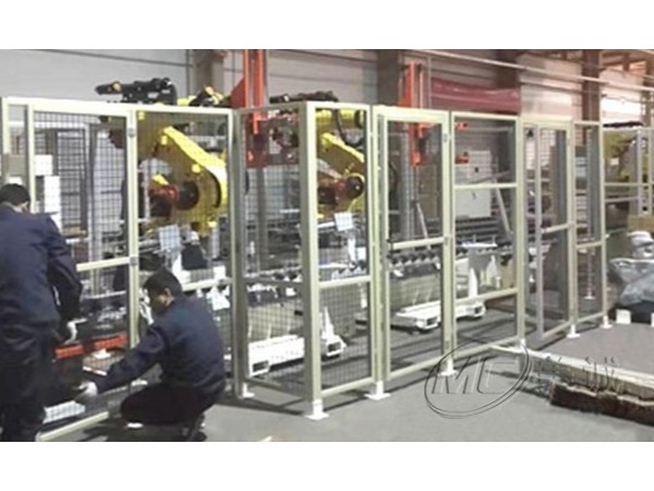 機器人護罩是在設備外圍建立安全范圍防護措施,以劃分安全范圍,阻隔人或物與設備直接接觸,起到安全警示作用,常和報警及斷電設備配套使用。框架部分使用鋁型材,配合絲網、亞克力、PC等各類板材,通過鋁型材配件安裝膨脹螺栓連接鋁型材立柱和地面。